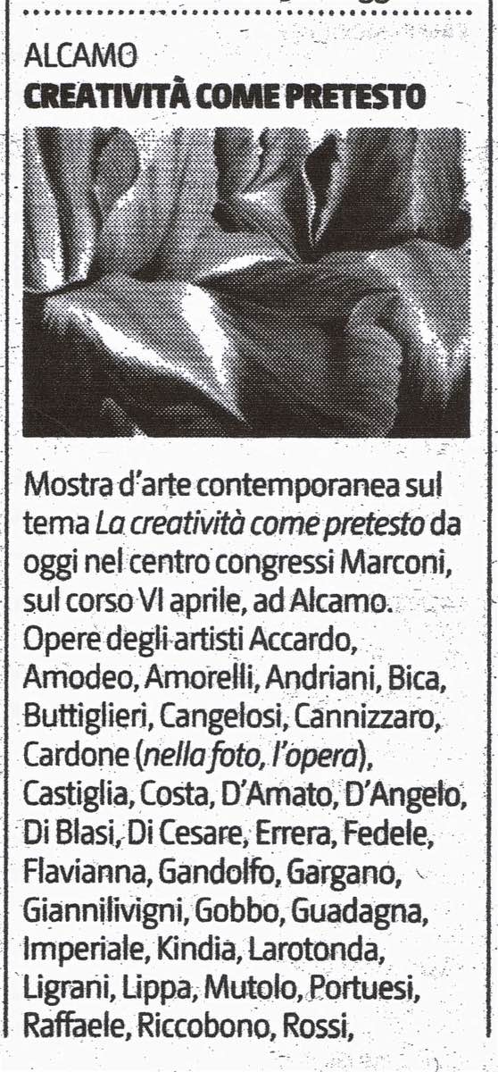 Nel 2009, ho partecipato ad una collettiva intitolata “La creatività come pretesto” presso il centro congressi Marconi di Alcamo.