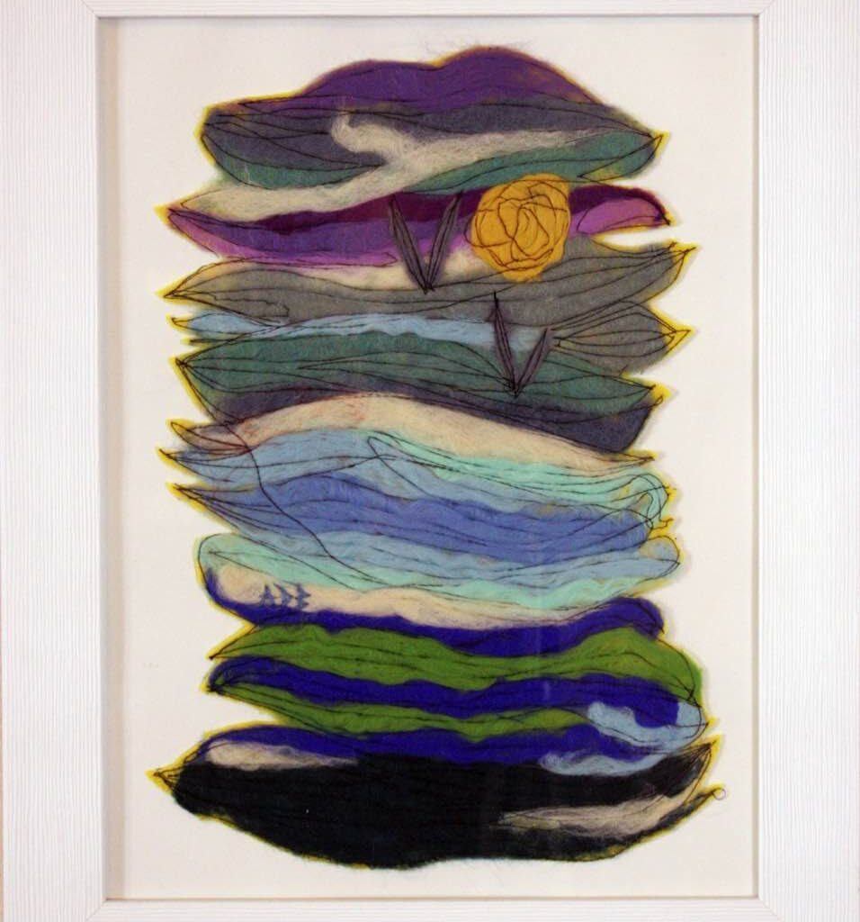 Quando Angela Di Blasi precisa i “toni maggiori e i toni minori” del colore lo fa ricorrendo alla scelta delle tecniche (mai banali), dei materiali (scarti e riuso) e del loro accostamento inusuale: cuciarte su carta a mano e ricamo a macchina per segnare ritmicamente la danza della Donna con il Mare e lavorazione della lana cardata su feltro e ricamo a macchina per illustrare l’insieme di spunti melodici, anche molto diversi tra di loro per ritmo e armonia, dedicati al Mare.